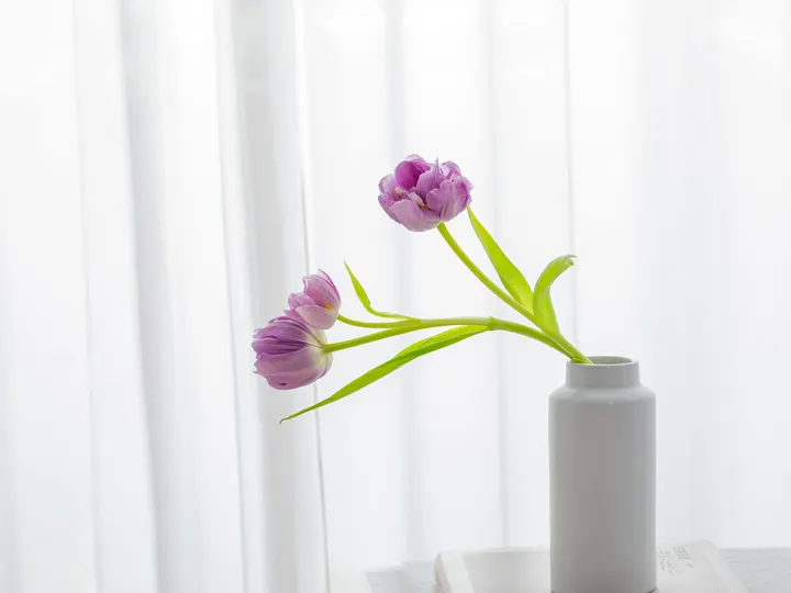 白纱、白瓶、紫花,构成了一幅安静的画面,仿佛时间都在此刻放慢了脚步。