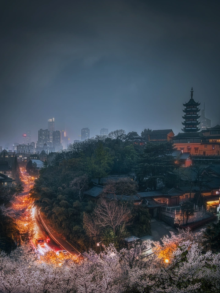Misty Taicheng, Blossoms Reflect the Ancient Temple 三月末的南京,烟雨笼城,樱花映寺。古鸡鸣寺与药师佛塔静立暮色之间,灯火与楼影隐现,勾勒出金陵春夜含蓄而悠远的诗意。#南京 #金陵 #台城 #南京城墙 #古鸡鸣寺 #药师佛塔 #樱花 #鸡鸣寺樱花 #烟雨江南 #六朝古都 #春夜 #城市夜景 #古都风韵 #历史文化古城 #风光摄影 #城市风光 #春日南京