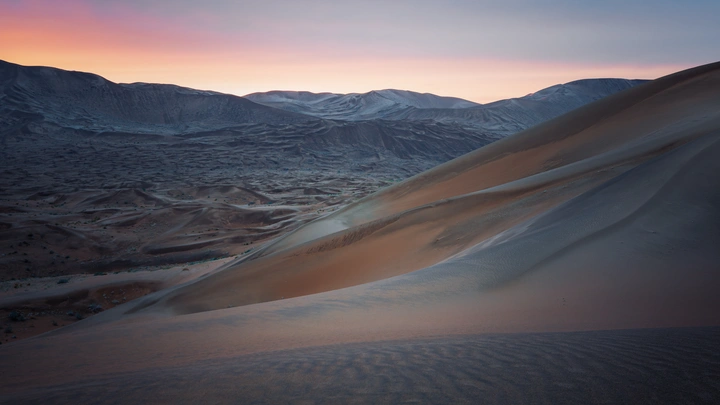 拍摄于2020年8月的巴丹吉林沙漠。暮色初临,天边残留着温柔的微光,映照着起伏的沙脊与远处沉静的山体。沙丘的曲线在冷暖色调交织中显得愈发柔和而深远,仿佛大地在日夜交替之间缓缓沉息,展现出沙漠辽阔、静穆而富有层次的壮美。#巴丹吉林沙漠 #沙漠摄影 #风光摄影 #暮色沙丘 #沙脊线条 #大地肌理 #静谧之境 #荒漠之美 #中国风光 #摄影作品