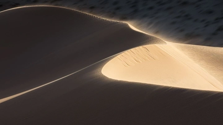 Light Cuts the Dune 夏日的巴丹吉林沙漠里,强烈光线从沙脊边缘划过,把起伏的沙面雕刻成近乎抽象的形状。明与暗在这一刻被压缩到极致,沙丘不再只是风景,而像一件由风与时间共同完成的雕塑。#巴丹吉林沙漠 #沙丘摄影 #抽象风光 #极简摄影 #光影构成 #线条之美 #沙海雕塑 #自然肌理