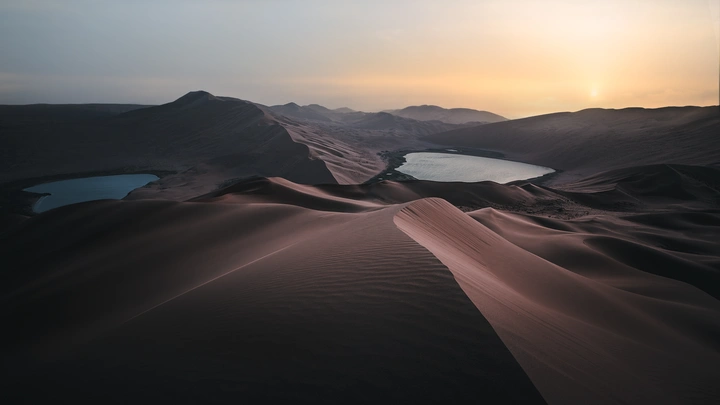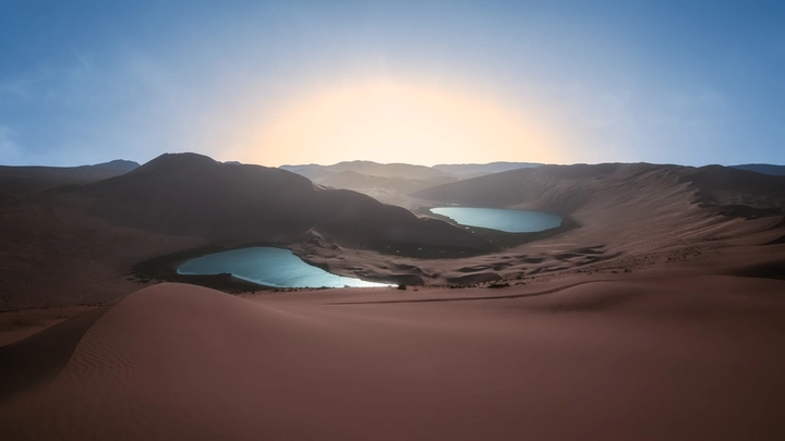 拍摄于8月的巴丹吉林沙漠,两泓湖水静卧在高大沙丘之间,像荒漠深处忽然睁开的两只眼睛。天际的强光把群山与沙脊压成深色剪影,也让这片沙海显出罕见的清凉、辽阔与神秘。 #巴丹吉林沙漠 #沙漠湖泊 #双湖景观 #逆光风光 #沙丘地貌 #夏日荒漠 #自然秘境 #BadainJaranDesert #DesertLakes #TwinLakes #BacklitLandscape #