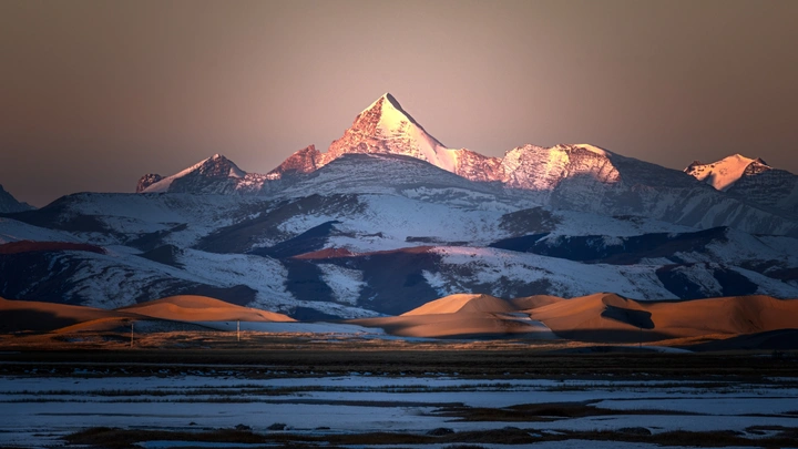 Kaqie Gangri: Alpenglow on the Summit 冬日上午的斜光落在卡却岗日主峰之上。雪脊被照亮成温柔的金粉色,山体的岩纹在冷蓝阴影里更显锋利;眼前起伏的丘陵被阳光擦出一段暖色弧面,与雪线、暗部和天空的渐变共同叠出清晰层次。暖与冷、柔与峻,在高原的清冽空气里相遇,宁静而有力量。#卡却岗日 #西藏 #中国 #雪山 #晨光 #上午光 #冬季 #日照金山 #金色光 #冷暖对比 #层次感 #山脊 #雪线 #高原风光 #丘陵 #风光摄影 #自然风光 #静谧 #辽阔 #光影 #20251206 #我的摄影故事# 溯源雅鲁藏布江 收起