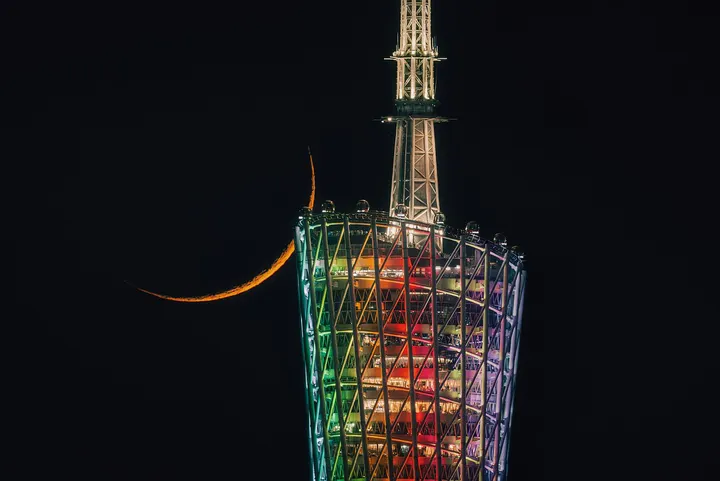 夜色渐浓,广州塔的霓虹便次第醒。七彩的钢架像被揉碎的彩虹,在黑夜里铺展成张扬的轮廓。弯月悬在旁侧,橘色的弧光轻轻勾着塔尖,像是给这座硬朗的城市地标,系上了一枚温柔的月痕。风掠过珠江的水面,塔与月的光影交叠,羊城的浪漫,就藏在这样不经意的相逢里。