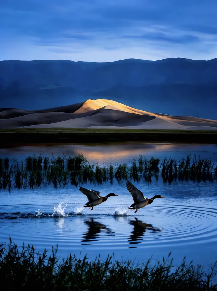 当蓝调的幕布缓缓垂落,这片沙与水的秘境便从沉睡中醒转。远处的山峦沉在靛蓝的雾霭里,像蛰伏的巨兽,轮廓在天光里渐次模糊;而近前的沙丘却被最后一缕天光吻醒,金箔般的沙脊在冷调背景上铺开,像大地摊开的信笺,写着黄昏未散的余温。 湖水是另一片倒置的天空,蓝得深邃,又因沙脊的倒影而漾着暖金。水草在水面织就墨色的蕾丝,随波轻晃,像在私语着只有风才懂的秘密。忽然,两只野鸭振翅而起,翅膀划破蓝绸般的水面,溅起的水花如碎钻般在蓝调里闪烁,又迅速落回,在湖面织就一圈圈同心圆,把沙脊的倒影揉碎,再慢慢重组。 它们的翅膀扇动着风,也扇动着这片秘境的心跳。红掌轻蹬水面,带起的涟漪漫过水草的倒影,把寂静的湖面搅出细碎的声响。野鸭的身影在水面投下深黑的剪影,与金辉沙脊、蓝调远山形成奇妙的呼应,像自然之手在画布上点下的重音,让这片静谧的天地瞬间有了呼吸的节奏。 风掠过湖面,带着沙粒的微温与水草的清冽。当野鸭的身影渐远,涟漪慢慢平复,湖水又重归静谧,只留下金辉沙脊在蓝调里静静伫立,像在等待下一次苏醒。这片沙与水共生的秘境,便在寂静与生机的交替里,每一道涟漪,都是时光的低语;每一片金辉,都是大地的深情。
