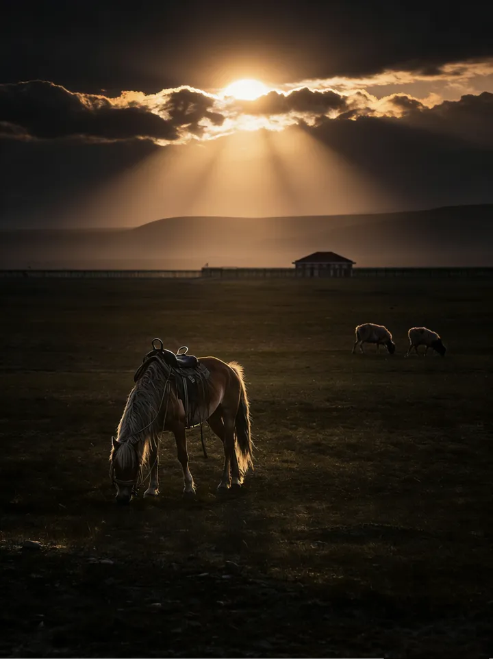 当最后一缕金芒挣脱云层的桎梏,草原便被镀上了一层融化的蜜色。光束如神谕般倾泻而下,穿过厚重的云幕,在苍茫大地上织就一张金色的网。棕马垂首,鬃毛在风里轻晃,马鞍的皮革还带着余温,却已卸下了白日的奔忙,此刻它只愿在余晖里,做一只安静的食草者,把喧嚣还给风,把自由还给大地。 远处的羊儿低头啃食,蹄声轻得像梦的呓语,那座红顶小屋在暮色里静立,像在等晚归的牧人。风掠过草尖,带着牧草的清香,把时光揉得柔软而绵长。在这里,时间是慢的,慢到能听见马咀嚼青草的声响,慢到能看见云影在草原上缓缓移动。 这不是一幅静止的画,是草原一天的收梢。这匹棕马,或许曾载着牧人穿越风雪,踏过星河,此刻却只愿在这片熟悉的草甸上,与天地温柔相拥。夕阳沉得更低,光束渐次收拢,马抬起头,望向远方的山影,眼里映着最后一抹金辉。它知道,当夜色漫过草原,星辰会升起,而明天,朝阳又会唤醒这片土地,它会再次奔向更远的旷野。 这帧画面,是草原写给我们的情书——没有激昂的宣言,只有安静的陪伴,只有时光的温柔。它告诉我们,真正的自由,不是永不停歇的奔跑,而是在天地辽阔里,找到属于自己的那片草甸,低头便能与世界温柔相拥。