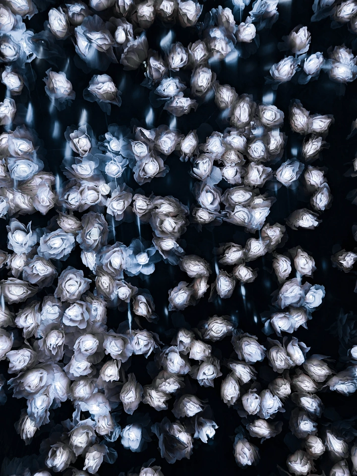 在这片由白玫瑰织就的深海里,每一片花瓣都像一段被打捞的记忆,在幽暗中悬浮、流转。它们褪去了尘世的艳色,以近乎透明的姿态,诉说着关于消逝与永恒的低语。这不是凋零,而是一种轻盈的重生——当美挣脱了土壤的束缚,便化作了时间里流动的光。我们凝视着这片花海,仿佛也在凝视自己内心深处那些未被言说的情绪,在寂静中,与世界达成了和解。