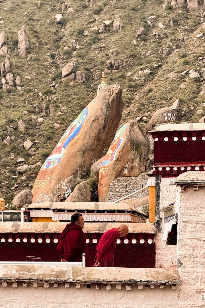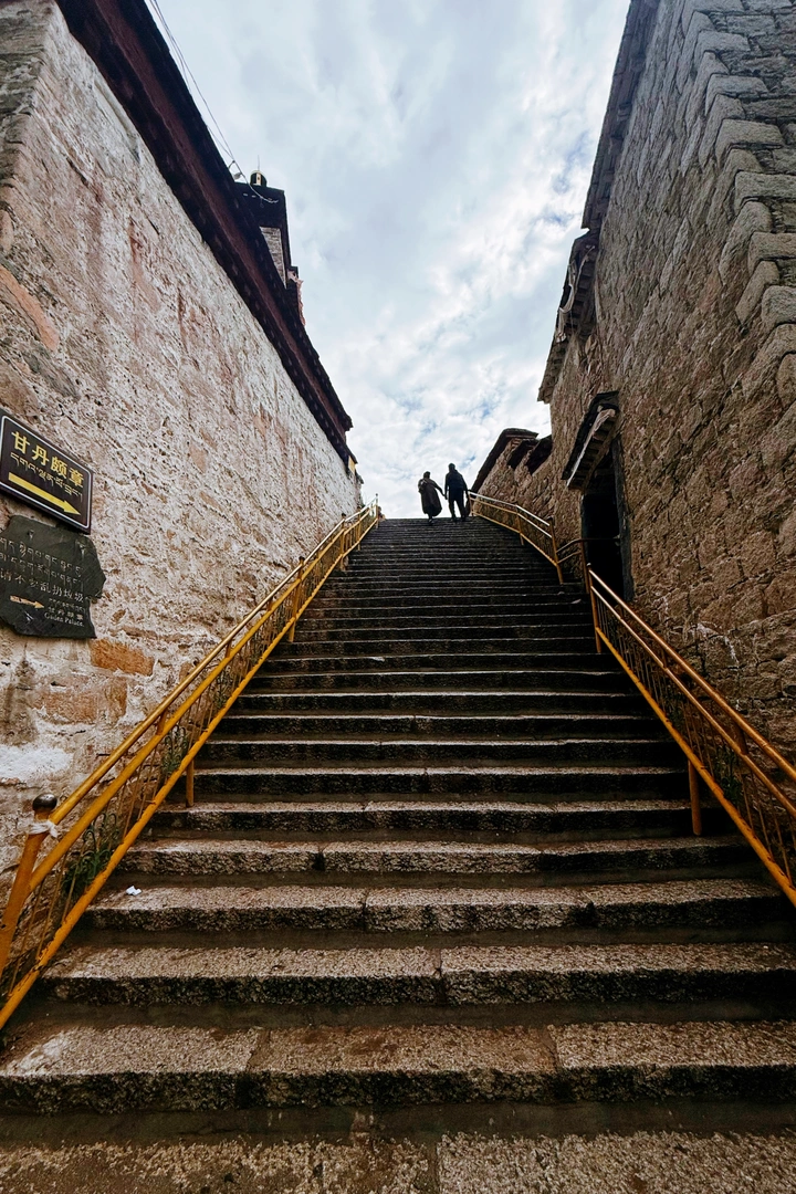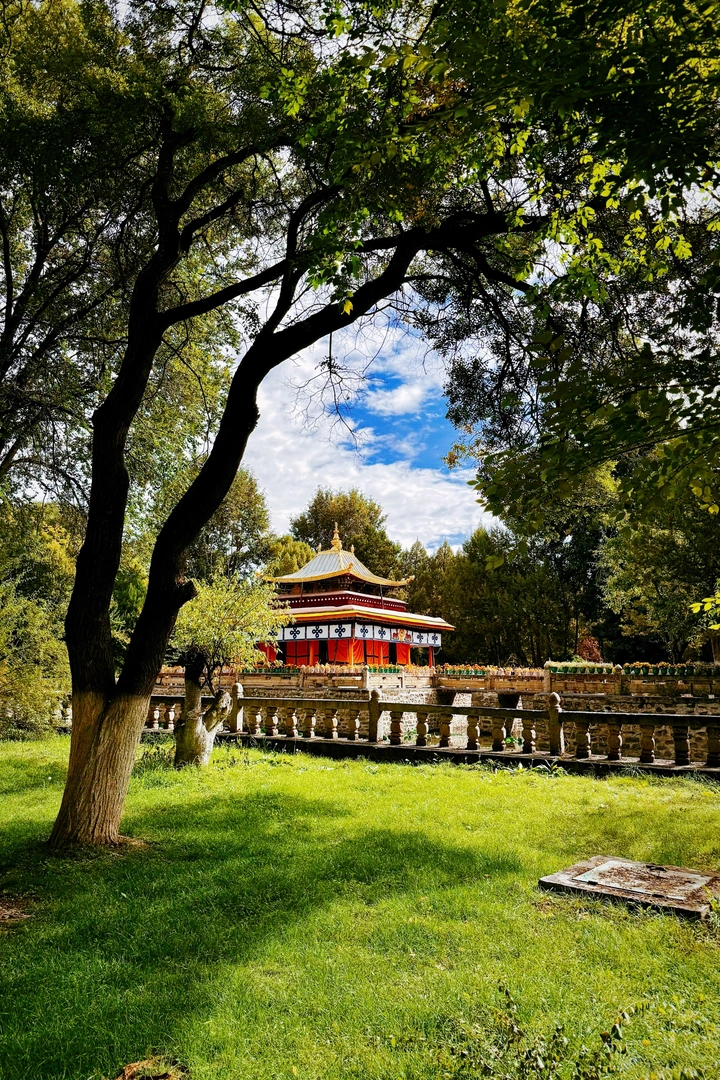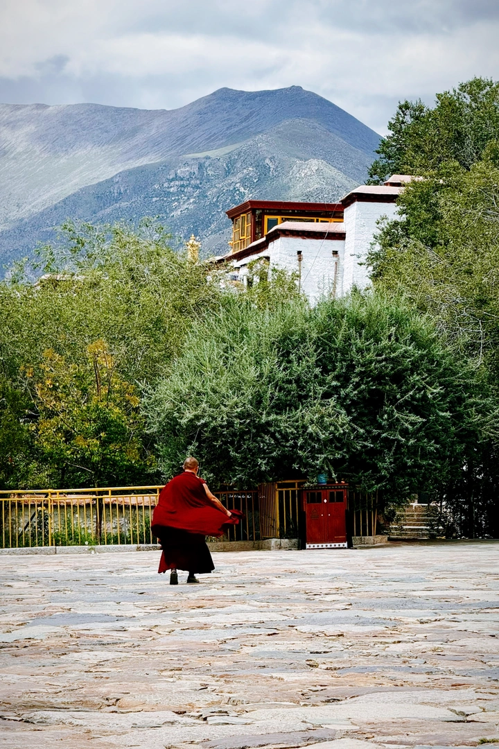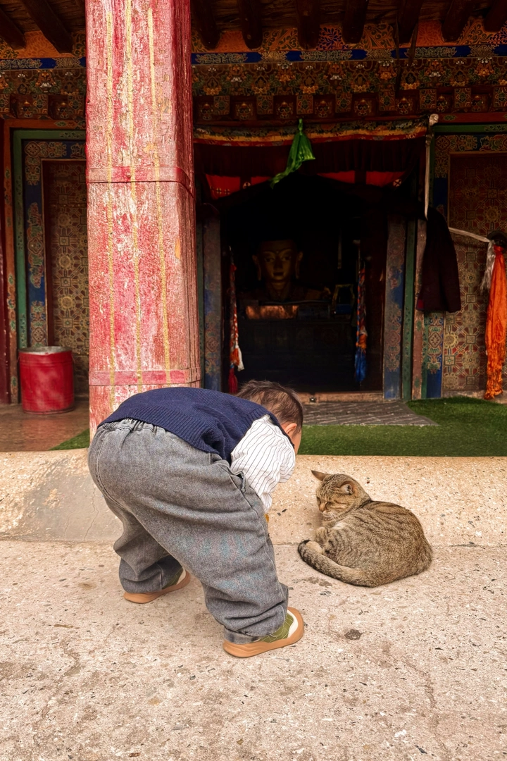 哲蚌寺内,一名可爱的藏族儿童好奇地观望着,卧在门前晒太阳的猫咪,而寺门内隐约的佛像,守望着眼前的和谐景象。被眼前的这份和谐感动,悄悄按下手机快门,留住这份美好。