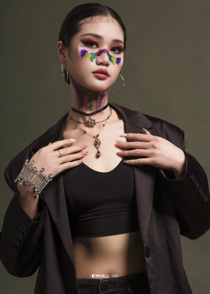 出镜:Polina 妆造:LingLing 摄影:Arrowsun 她头戴绚丽羽毛冠冕,红如炽热火焰,蓝似深邃苍穹,黄若灿烂暖阳,绿像盎然生机。那灵动的羽毛仿佛有了生命,于黑暗背景中肆意张扬。她的手指轻触唇畔,似在诉说无声的秘密,眸光如星,穿透心灵的迷雾。这一刻,时尚不再是表面的装扮,而是个性与灵魂的极致绽放,每一根羽毛都在演绎独特的故事,每一抹色彩都在奏响个性的乐章。