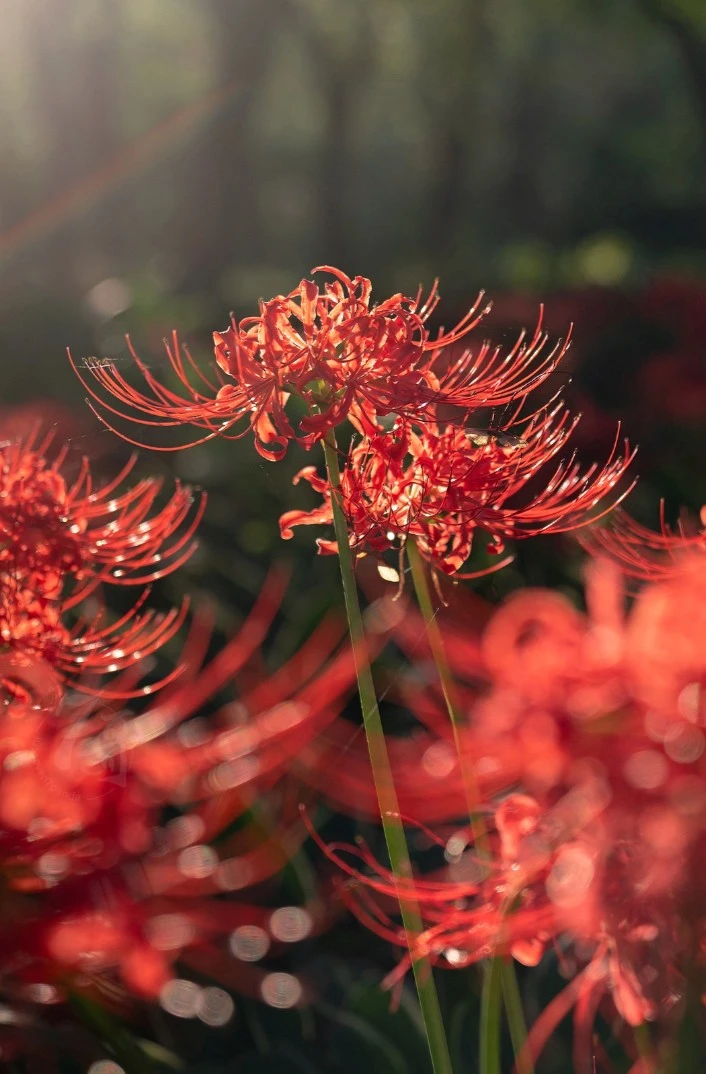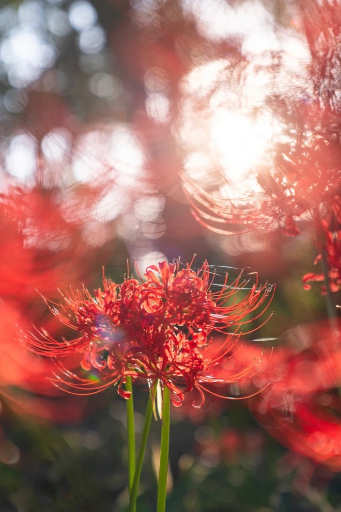每当秋分时节,曼珠沙华便在黄泉路上绽放,仿佛是开在天国的花朵,为逝去的灵魂指引方向。它的花朵形状如同一只只在向天堂祈祷的手掌,既充满了哀伤,又燃烧着爱情的忠贞。