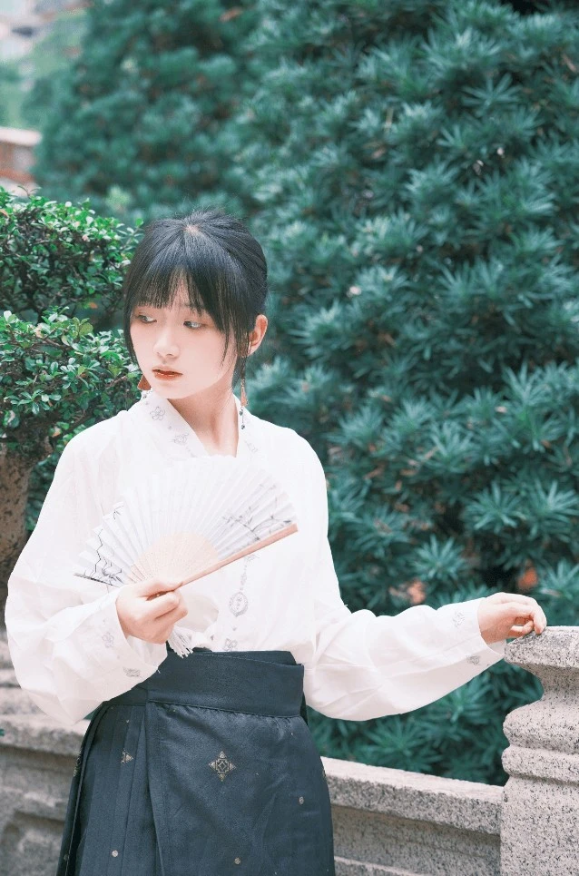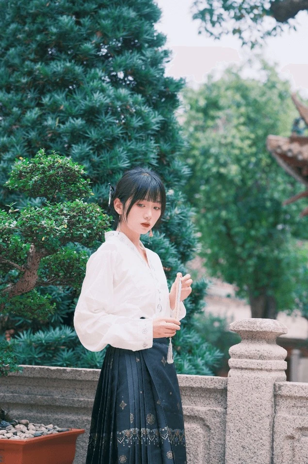 对于喜欢古风的你,可以选择一件明制的飞机袖对襟衬衫来搭配马面裙。这样的搭配不仅在朝代和样式上与马面裙相得益彰,还能展现出一种古代官宦之家女性的贵气和庄重感。