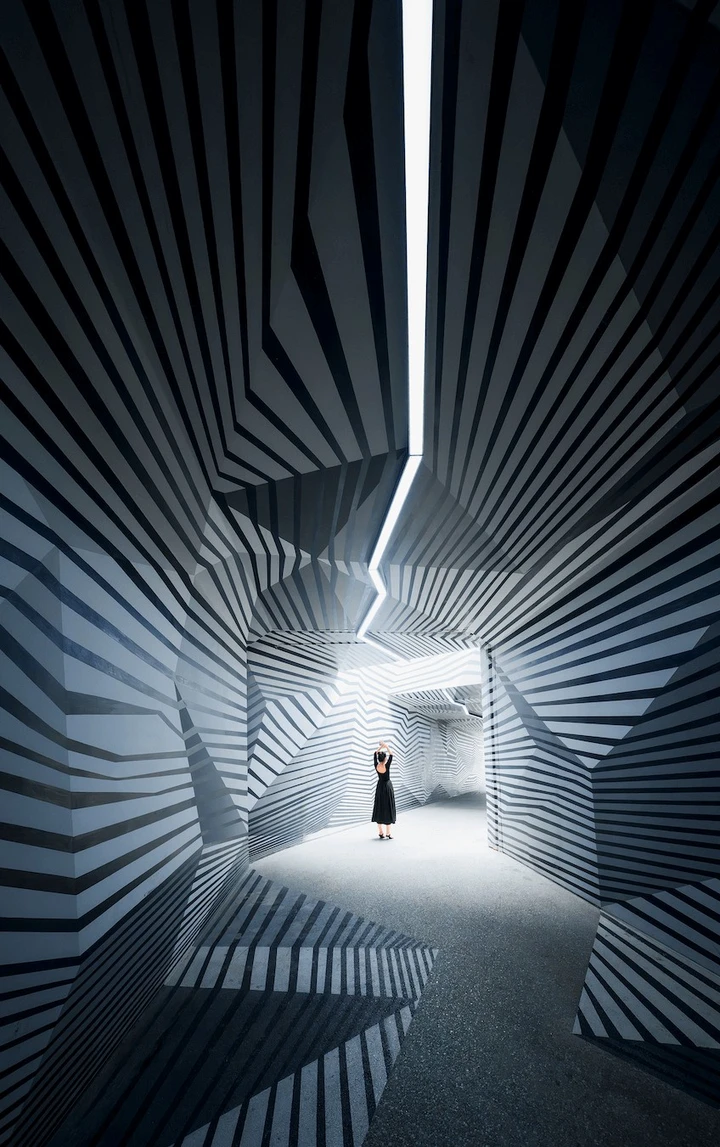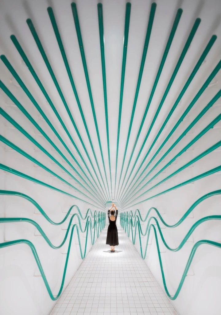 第二个地方是斑马隧道,坐地铁1号线到红石公园站下,然后从A口出。出来后步行导航到“四川郎酒股份有限公司”,旁边有个下行阶梯,下去左转就到了。这里肉眼看上去有3D裸眼的效果,并且中间还有天井,灯光打下去,会有一种时光隧道的既视感。模特站在这里,随便一拍就能出片。