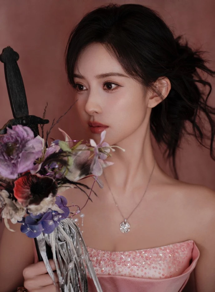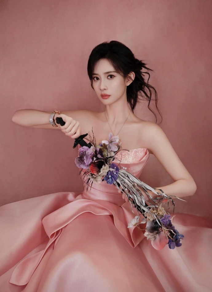 她的头发被精心盘起,上面点缀着花朵装饰,既展现了她的端庄大方,又不失女性的柔美与细腻。这样的发型设计不仅与礼服的颜色和风格相呼应,还巧妙地提升了整体的造型感,让人过目难忘。那束紫色的花挂在墙上,与孟子义的粉色礼服形成了鲜明的对比,却又如此和谐地融为一体。这样的背景设计不仅突出了她的主体地位,还为她增添了几分神秘与高贵的气质,在这样的环境中,孟子义仿佛成为了一位从童话中走出的公主,每一个动作都散发着迷人的魅力。