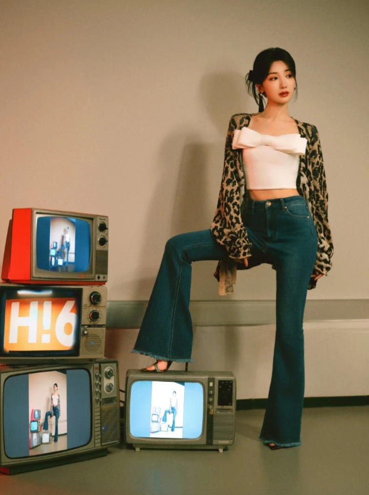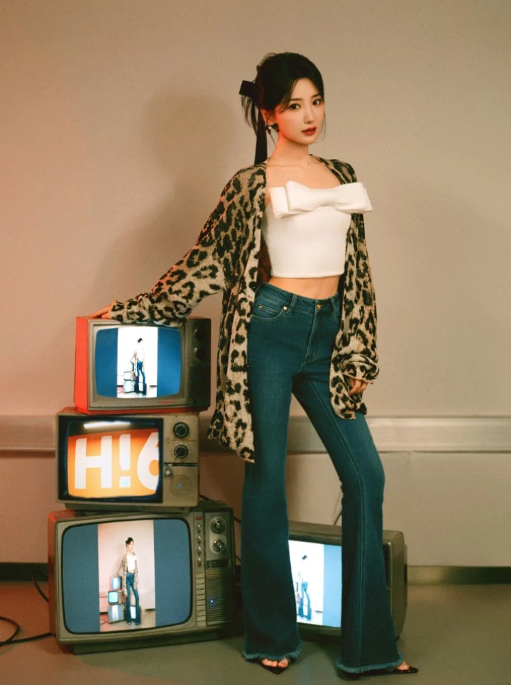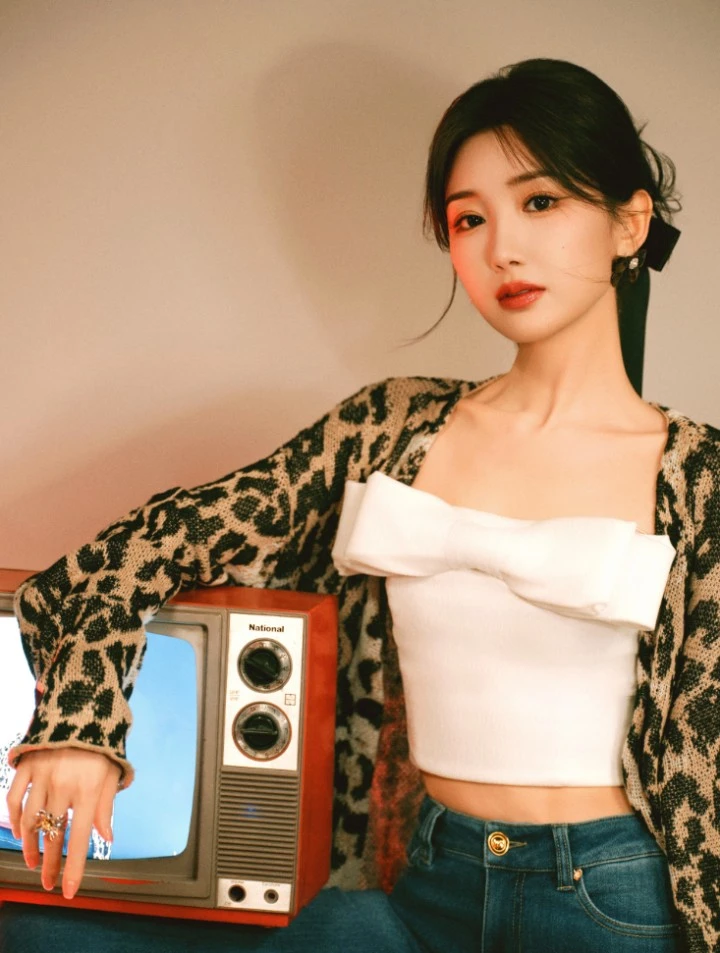 背景中的复古电视机元素,为造型增添怀旧氛围。电视屏幕的光影与人物穿搭形成互动,豹纹的野性、蝴蝶结的甜美、牛仔裤的经典,在复古场景中碰撞出独特化学反应。这种氛围营造让穿搭不局限于单品本身,更传递出一种对多元时尚的包容与表达,仿佛在诉说:时尚从不受风格定义,大胆混搭才是潮流本色。