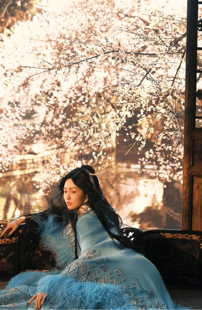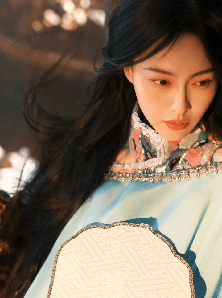 在这组造型中,唐嫣身着一袭浅蓝色华服,清冷的色调宛如春日里澄澈的天空,给人一种宁静而又高贵的感觉。华服上点缀着精致的刺绣,细腻的针脚勾勒出灵动的图案,仿佛在诉说着古老的故事。衣袖处轻柔的羽毛装饰,为整体造型增添了几分飘逸感,随着她的动作轻轻摇曳,似有若无地撩动着人心。她手持一把简约的团扇,古韵悠然。团扇上的几何纹路设计,既保留了传统元素的韵味,又融入了现代时尚的巧思,与服饰搭配相得益彰。发型上,几缕发丝自然垂落,增添了几分随性与柔美。一支简约的发簪点缀其中,看似不经意,却恰到好处地点亮了整个造型,尽显东方女性的温婉典雅。