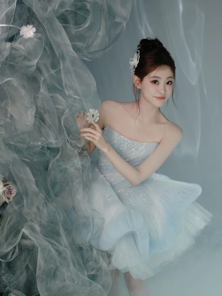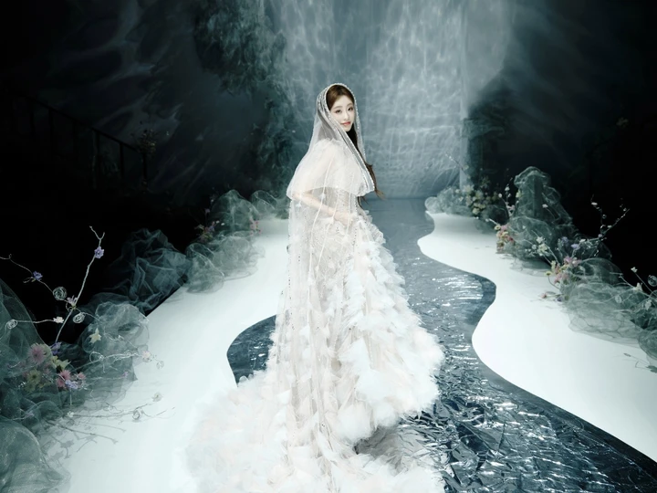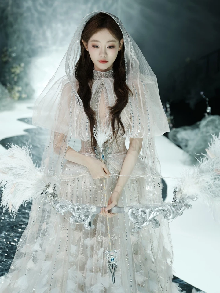 当镜头定格在祝绪丹身着梦幻纱裙的瞬间,所有人都忍不住惊叹这份极致的浪漫美学。轻盈如雾的薄纱自肩头倾泻,缀满细密珠饰的头纱勾勒出柔美的轮廓,层叠的羽毛裙摆似裹挟着云端的诗意,每一处细节都在诉说着童话般的梦幻。这不仅是一次造型的突破,更像是祝绪丹对“美”的一次深度诠释——她总能在优雅与灵动间找到完美平衡,既有着公主般的矜贵,又藏着少女的灵动俏皮。而这份对美学的敏锐感知,恰似她在演艺道路上的坚持,永远在突破中寻找新的自我表达。