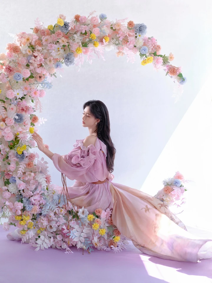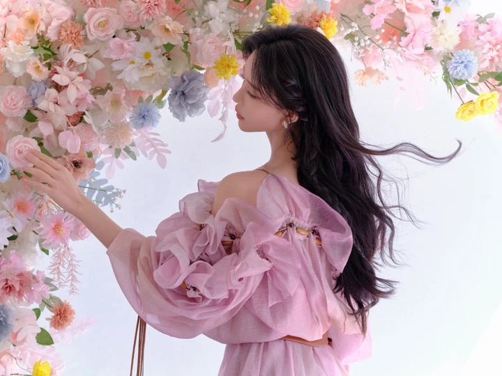 在光影流转的舞台上,孟子义一袭粉色仙裙惊艳亮相,瞬间俘获众人目光。那柔和的粉色如春日里轻绽的樱花,与飘逸的裙摆、灵动的荷叶边相互映衬,每一步摇曳生姿,每一次顾盼流转,皆似从画中走来的仙子,美得让人移不开眼。这般梦幻的妆造,恰似她演艺生涯的注脚——既有着令人心醉的外在之美,更蕴含着内在的坚韧与纯粹。