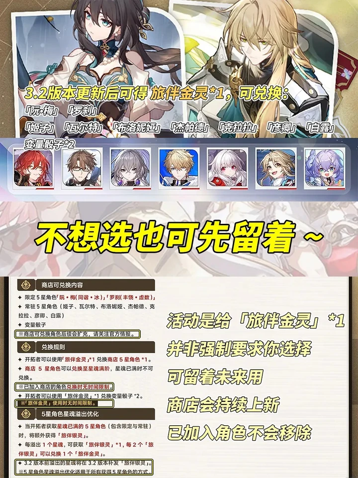 综合来看,如果你的队伍里泛用辅助不够,阮梅0魂就是很好的选择;要是刚好有5星魂罗刹,拿下6魂进一步提升队伍实力也不错;还在使用阮梅的玩家,1魂的提升也值得考虑。要是队伍生存位不够,罗刹0魂也能解燃眉之急。当然,如果这些情况都不适用,也不用着急做决定。「旅伴金灵」永久有效,兑换商店后续还会不断扩充新角色,以后再选也来得及。希望大家都能选出适合自己队伍的角色,在星穹铁道的世界里玩得开心!