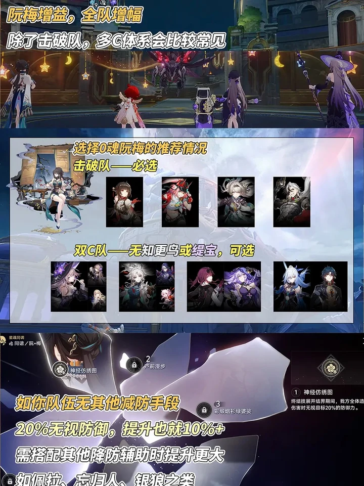 先来说说阮梅,她可是泛用型同谐角色,在「击破队」里堪称核心。阮梅的技能机制相当丰富,普攻、战技、终结技等相互配合,能大幅提升队伍的弱点击破效率,还能给队友加速、增加抗性穿透。从星魂角度看,0魂本体就有不错的表现,持有乱破、流萤等特定光锥的玩家选择她,能轻松组建超击破体系;1魂时终结技期间可提供20%无视防御,对输出提升明显,队伍里减防相关机制越多,提升效果越显著。不过2 - 6魂提升相对有限,在当前版本实用性不算太高。在配队上,双C队或者三辅一队中阮梅都能发挥重要作用,与不同主C搭配能产生多样的化学反应。