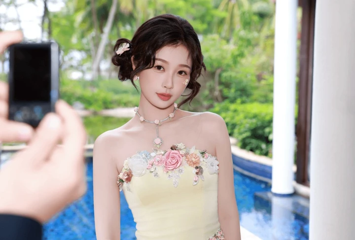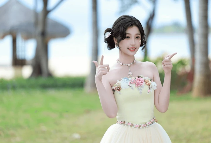 在时尚的缤纷世界里,虞书欣又一次以令人惊艳的造型抓住了众人的目光。一袭浅黄色抹胸花朵裙,宛如从梦幻花园中翩然而至的精灵,美得动人心魄。这条裙子,是甜美与浪漫的完美融合。抹胸设计大方展露她精致的肩颈线条,流畅而优美,仿佛是被春日暖阳精心雕琢。裙身点缀着五彩斑斓的花朵,粉色、白色、橙色的花朵相互交织,恰似一场盛大的春日花事,在裙上悄然绽放。花朵栩栩如生,仿佛带着清晨的露珠,散发着馥郁芬芳。蓬松的裙摆似云朵般轻盈,每一步都像是在云端漫步,营造出如梦似幻的氛围。