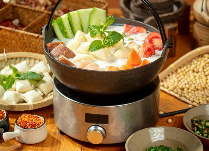 初见这锅豆米火锅,难免会被它的“平平无奇”骗到——浅黄的汤底浮着饱满的花豆,零星的软哨碎点缀其间,既没有红油的张扬,也不见酸汤的热烈。可当木勺搅动汤底,豆米在慢火熬煮中渐渐出沙,细腻的豆蓉与骨汤交融,化作一锅绵密浓稠的“黄金汤”,舀一勺浇在白米饭上,米粒裹着豆香在舌尖化开的瞬间,便懂了贵州人对这碗火锅的执着:原来真正的美味,从不需要浓妆艳抹,骨子里的醇厚就能征服所有挑剔的味蕾。