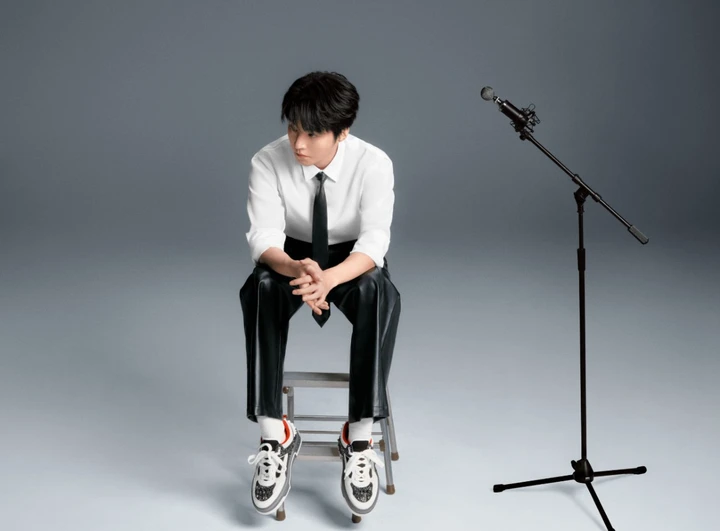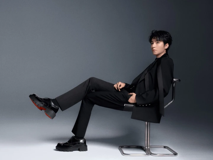 脚上的鞋色彩搭配丰富,与皮裤的酷黑形成鲜明对比,在时尚中注入了活力与运动感。这种休闲单品与正装、皮裤的混搭,巧妙地平衡了整体造型的风格,既有正式场合的得体,又有街头潮流的不羁。在简约的灰色背景衬托下,王俊凯坐在麦克风旁,眼神专注而沉静,仿佛在音乐世界里思索。整个画面传递出一种既专注于艺术创作,又在时尚领域大胆探索的氛围。