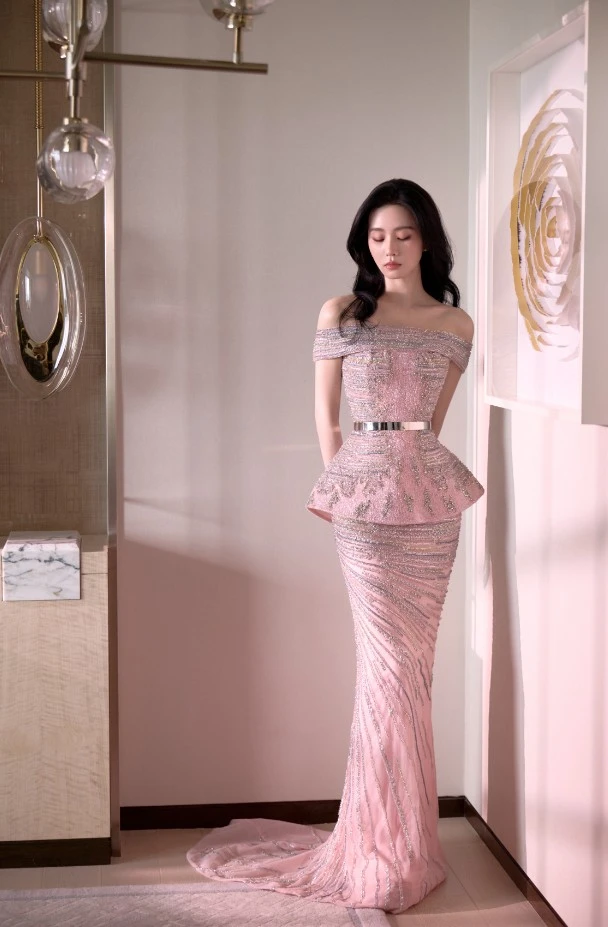 粉色亮片礼服的精髓在于对身材曲线的精准把控。肩部露肩设计通过低V领口拉长颈部线条,同时露出锁骨区域,既凸显女性柔美,又避免过度性感。腰部的收腰剪裁则巧妙修饰身形,让视觉重心落在腰臀比例上,营造出修长感。对于普通女生,选择类似设计的礼服时,可优先考虑V领加收腰款型,既能修饰肩颈线条,又能平衡整体比例。