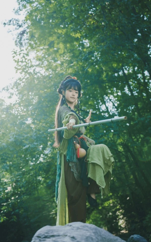 二、拍摄场景。自然环境:这组照片背景是山林、溪流,充满自然气息。选择拍摄场地时,山林、古寺、竹林、旧巷等具有古朴、清幽氛围的地方都很合适。自然环境中的光影和景色,能为照片营造出独特的意境。场景布置:若在室内或特定场地拍摄,可布置一些与武侠相关的道具,如木剑、酒坛、竹简等,打造出武侠生活或练功的场景。三、动作姿态。战斗姿态:图中人物持棍的姿势,展现出一种警觉和准备出击的状态。拍摄时可设计一些持剑、握棍的战斗动作,如拔剑、出棍、格挡等,体现武侠的英气与敏捷。日常姿态:除了战斗动作,一些自然的日常姿态也很有韵味,如倚靠着树、举杯饮酒、凭栏远眺等,能展现出武侠的潇洒不羁或沉思内敛。