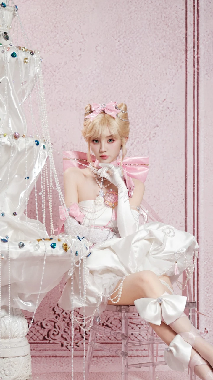 妆容上,蓝绿色美瞳宛如深邃的湖水,泪钻眼妆在灯光下闪烁着细碎光芒,眼线微微上挑,俏皮的猫须点缀其间,既可爱娇俏又带着一丝灵动狡黠。蝴蝶结与蕾丝元素的巧妙运用,更是为整个造型增添了几分甜美与优雅。