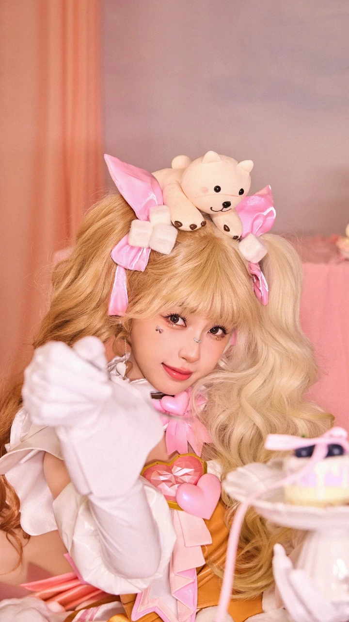 粉白蝴蝶结与小熊发饰的点缀,更是为整体造型增添了几分俏皮与可爱,甜到让人忍不住心生欢喜。她手中拿着蛋糕,那甜美的模样,仿佛是童话中走出的甜心公主,让人忍不住想要靠近。