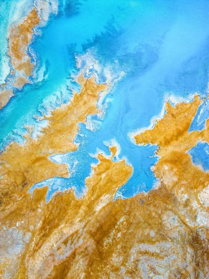 画面里那片沁人心脾的蓝,大概率是盐湖在施展魔法。高浓度的盐分让湖水告别了普通的颜色,转而呈现出从浅绿松石色到深邃钴蓝的渐变层次,仿佛一块被精心打磨的巨型宝石,在阳光下泛着剔透的光。而与蓝水接壤的黄褐陆地,更像是大地的指纹:富含矿物质的土壤经千万年风化、水流侵蚀,形成了如树枝般向水域延伸的纹理,那些曲折的轮廓,是岁月在大地上刻下的水流记忆。