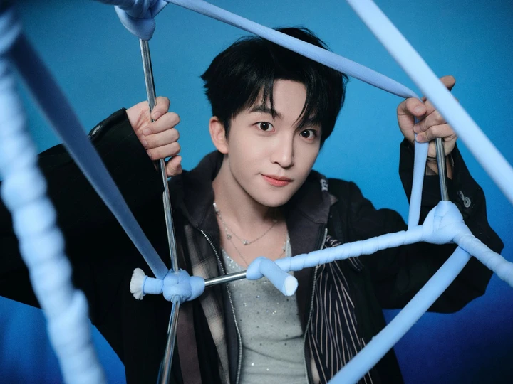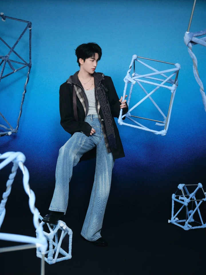 从舞台到时尚镜头,黄子弘凡始终在探索“风格的更多可能”。这套造型里,叠搭的巧思、妆容的克制、场景的呼应,共同编织出一个“既少年又先锋”的时尚叙事。或许,真正的时尚魅力,就藏在这种“不被定义”的探索里——如同他身旁的几何装置,每一面都折射出不同光芒,而黄子弘凡,正以造型为笔,在时尚与艺术的交界,书写属于自己的多面精彩。