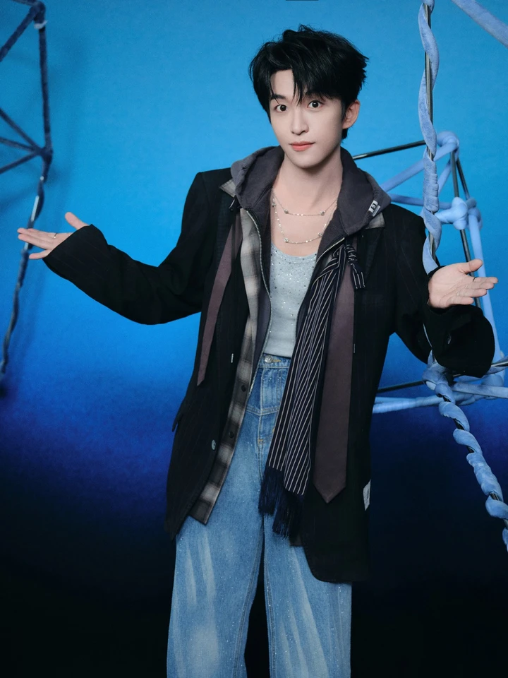 当镜头穿透靛蓝色的艺术结界,黄子弘凡以一套充满先锋张力的叠搭造型闯入视野——利落剪裁的黑色西装外套,与格纹连帽衫、闪钻内搭完成层次对话,随性垂坠的条纹围巾为硬朗线条注入松弛感,水洗牛仔的复古肌理则在脚下铺陈出少年的自在步调。背景中缠绕着淡蓝织物的几何装置,仿佛将时尚与艺术的边界悄然消融,每一寸光影都在诉说:这场造型实验,不止于穿搭,更是一场关于“打破与融合”的美学宣言,让观众在视觉冲击中,嗅到了时尚与艺术共振的新鲜气息。
