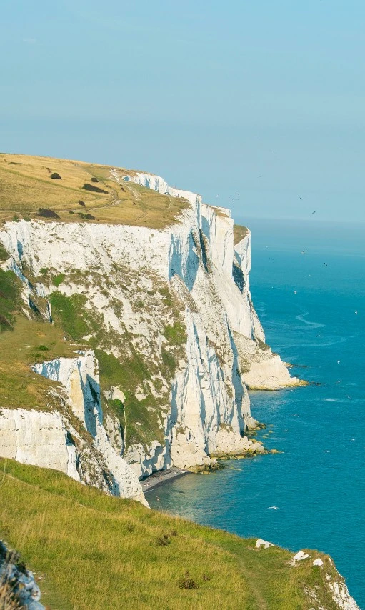 英国白崖主要分布在英格兰南部海岸,最著名的当属多佛白崖。它的形成堪称一部波澜壮阔的地质史诗。在距今约1.3亿年前的白垩纪时期,无数微小的海洋生物如颗石藻、浮游生物死亡后,它们富含碳酸钙的残骸不断沉积在海底。历经沧海桑田,这些沉积物在压力与时间的作用下,逐渐固结成白色的白垩岩。而后,又经过地壳运动的抬升与海水、风雨的侵蚀,最终形成了如今垂直陡峭、高耸入云的白色悬崖景观。