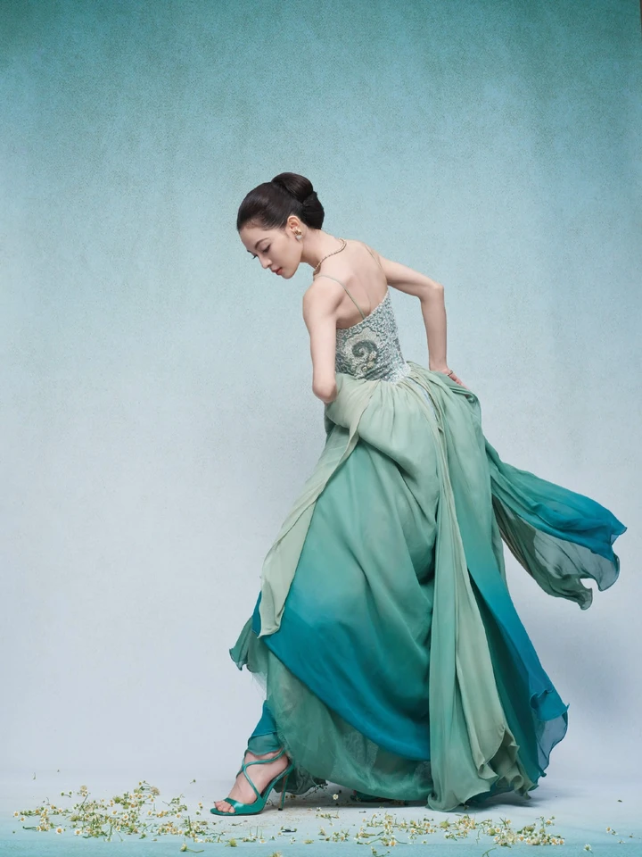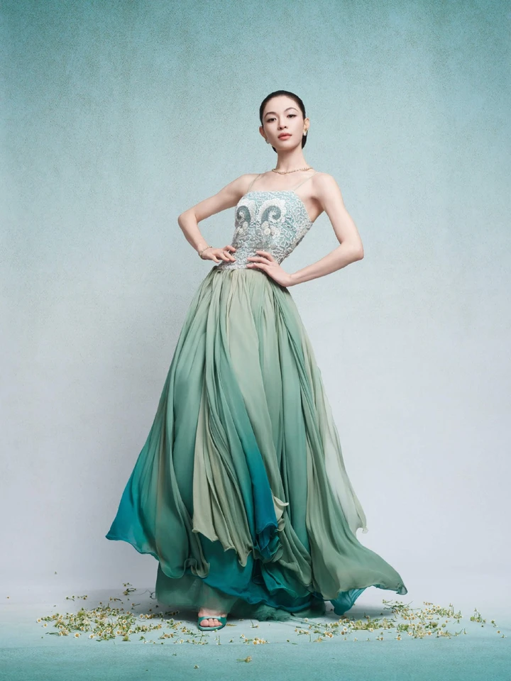 这种将自然元素抽象化的设计理念,恰是钟楚曦时尚表现力的独特之处。她没有选择夸张的廓形或繁复的装饰,而是通过色彩心理学与面料工程的结合,让“水波”与“星辰”这两个宏大意象,以温柔的方式附着于礼服之上。当灯光洒在层叠的纱质面料上,水蓝色与翠绿色会随角度变化呈现不同光泽,宛如海面在阳光下闪烁的粼粼波光。这样的造型既保留了高级定制的工艺感,又让自然美学渗透进每一寸细节,难怪被网友称为“把银河穿在身上的女人”。
