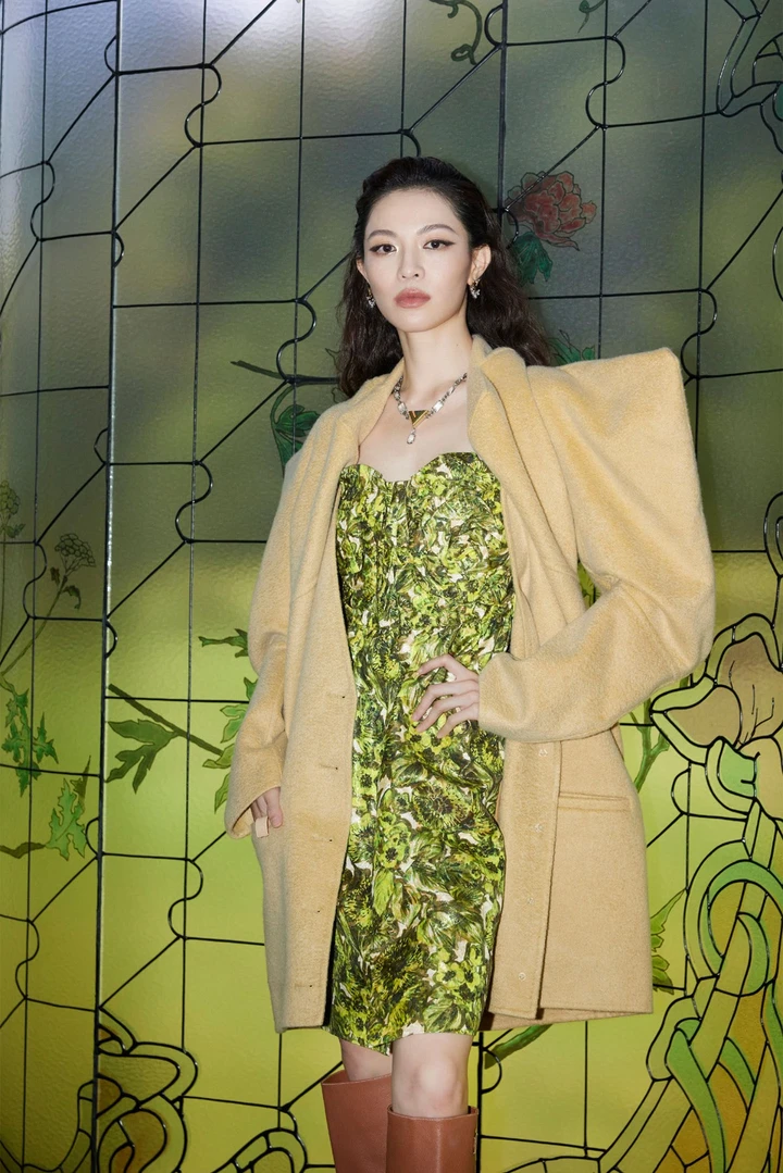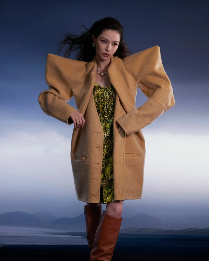 钟楚曦的这套穿搭,每一处设计都暗藏巧思。驼色廓形大衣采用夸张的宽肩剪裁,被网友称为“太平洋宽肩”“双开门造型”,硬朗的线条勾勒出建筑感十足的轮廓,气场瞬间拉满。而内搭的绿色连衣裙则巧妙中和了硬朗感,通过撞色搭配为整体造型增添灵动感。妆容上,她选择凌厉的黑色眼线和哑光底妆,强化酷飒气场的同时,突出自己立体的骨相;贴头皮盘发更是直接考验头骨比例,好在她生图下饱满的颅顶和流畅的面部线条,轻松驾驭住了这个发型,被网友赞为“教科书级骨相”。