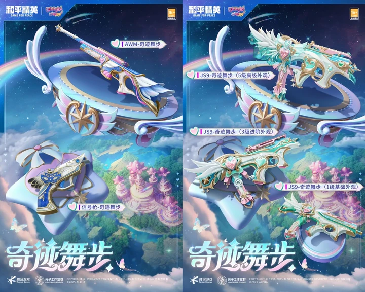 本次联动上线的内容相当丰富,五款角色皮肤各有亮点。贝贝的绿色蓬蓬裙、雅雅的青色层叠裙彰显双子星公主的尊贵与羁绊,美琪的蓝白造型灵动活泼,美雪的樱花粉套装甜美又不失战力,而承载童年回忆的游乐皮肤更是能通过“拯救魔仙堡”活动免费领取。此外,魔仙装备也惊艳登场,JS9升级枪、粉蓝AWM等枪械点缀着星钻与爱心水晶,头盔、背包等装备融入双子星、羽翼等元素,飞行器宛如魔法棒,让战场变身专属魔法世界。
