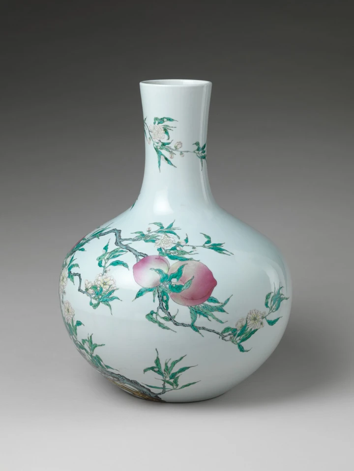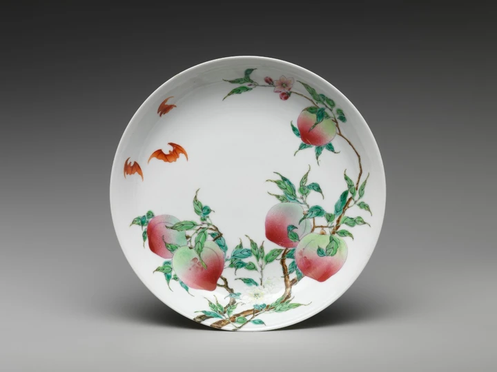 古人对“福”的偏爱,全刻在蝙蝠纹里。常见的“五蝠捧寿”,五只蝙蝠环绕“寿”字,暗合“五福临门”(长寿、富贵、康宁、好德、善终);若是见红蝠展翅,那便是“洪福齐天”,“红蝠”谐音“洪福”,仿佛天大的福气要扑进寻常生活。鹿纹则藏着“职场心愿”,“鹿”与“禄”同音,一只鹿配一只蝙蝠是“福禄双全”;若再添颗饱满的桃子,“福禄寿”三连击直接拉满——瓷面上的桃子从不是普通水果,而是“长寿符号”,《西游记》里的蟠桃传说早已让它与长寿绑定,九桃纹更是寓意“九九归一、长寿圆满”,要是桃枝上再立只寿带鸟,便是给“长寿”加了层buff,嘉庆款粉彩桃蝠灵芝纹撇口瓶上,桃的饱满、蝠的灵动,把“福寿双全”的心愿画得淋漓尽致。