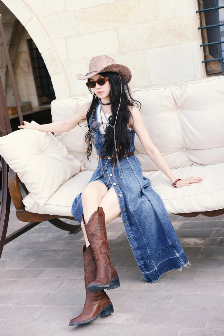 这组造型的成功,离不开诸多细节的巧妙加持。腰间点缀的金属链条装饰堪称点睛之笔,冷硬的金属质感与柔软的牛仔面料形成鲜明对比,瞬间提升了整体造型的酷感与精致度,而她标志性的甜美笑容又与这份酷飒形成奇妙反差,甜而不腻、飒而不冷,平衡得恰到好处。最值得一提的是她头上的宽檐牛仔帽,经典的西部元素设计,不仅强化了主题风格,还为造型增添了几分复古韵味,让她站在那里,就像从西部电影中走出来的女主角,气场全开。