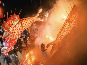 每年正月十三至十六,徽州古村汪满田便会上演震撼视听的民俗盛典。村民以竹为骨、以纸为鳞,扎制寓意"年年有余"的巨型鱼灯,展开连续四晚的嬉灯巡游——敬天地之德,礼祭先祖,祈愿岁岁丰饶。