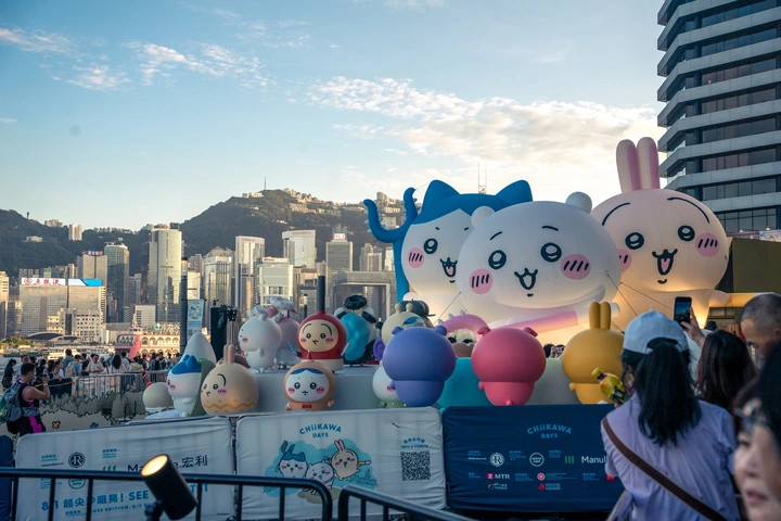 香港k11边维多利亚港口 chiikawa三小只在这里玩耍 日落的香港建筑与可爱的三小只同框 一种唯美得场景在这里浮现 吸引着众人前去打卡拍照