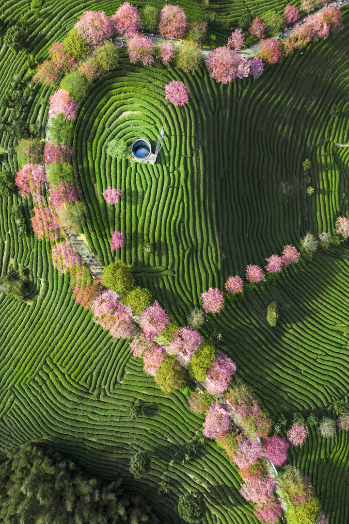夕阳漫过起伏的茶园,绯色的樱花就是春天的色彩