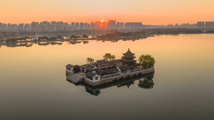 清晨的石湖天镜阁,如同镜面一般,水面泛着金光