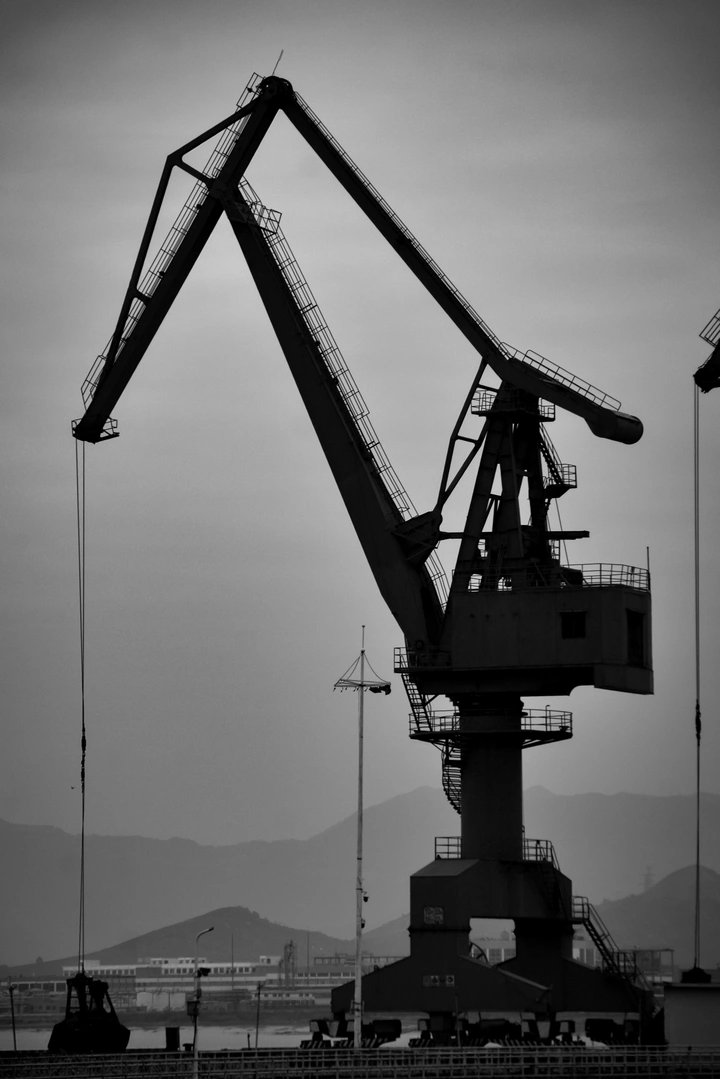 在码头我把镜头对准了这尊钢铁巨兽。 当黑白滤镜落下的瞬间, 所有鲜活的色彩都被抽走, 只剩下起重机锋利的几何线条, 和远处淡成剪影的山峦。 它像一尊沉默的工业雕塑, 在灰蒙的天光里, 把冰冷的钢铁拍出了史诗感。 我喜欢这种剥离色彩后的纯粹—— 没有多余的视觉干扰, 只有力量与孤独在画面里碰撞。 这就是我镜头里的港, 不是热闹的码头, 是一首写给城市工业肌理的黑白诗。