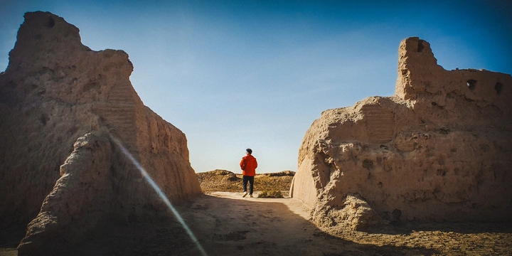 在我的家乡新疆阿克苏的戈壁深处, 我偶遇了一个古老城池的遗址。 两侧高耸的土坯墙如同一扇通往过去的门, 强烈的侧光在墙体上刻下了岁月的痕迹。 我站在门洞中央, 用橙红色作为视觉锚点, 与土黄色的遗址和湛蓝的天空形成强烈对比。 我刻意留下了纳入左侧的镜头眩光, 为这处古老的遗址增添一丝超现实的氛围, 最终定格下这张“我在历史中穿行”的瞬间。