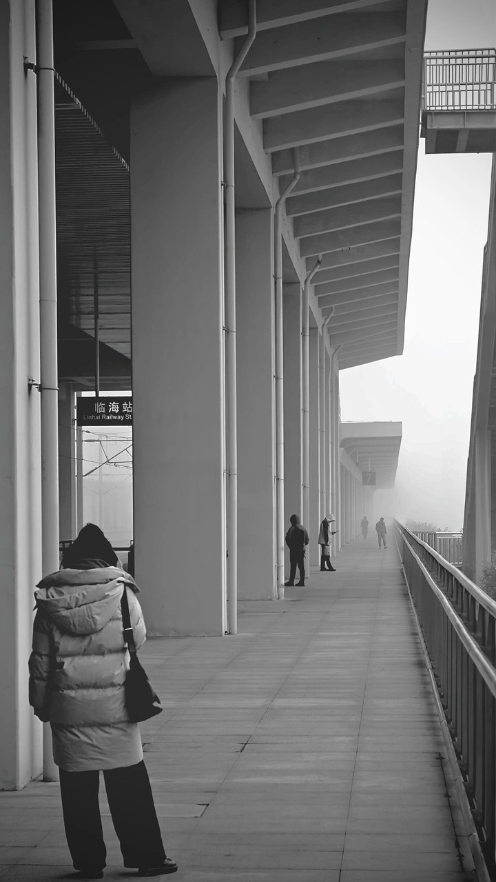 清晨的临海, 被一场大雾温柔包裹。 我从临海站出发, 一路捕捉雾与树的对话。 在站台, 利用重复的立柱和延伸的步道, 营造出纵深感, 让雾的层次层层递进; 在铁轨旁, 复杂的接触网在雾中化作抽象的线条, 与远处的虚无形成对比; 而路边的枯树, 在灰白的天空下, 成为最纯粹的剪影。 全程使用黑白模式, 剥离色彩干扰, 让雾的朦胧和树的轮廓成为画面的主角, 定格下这座小城清晨最安静的模样。