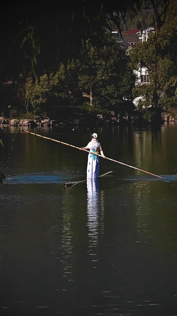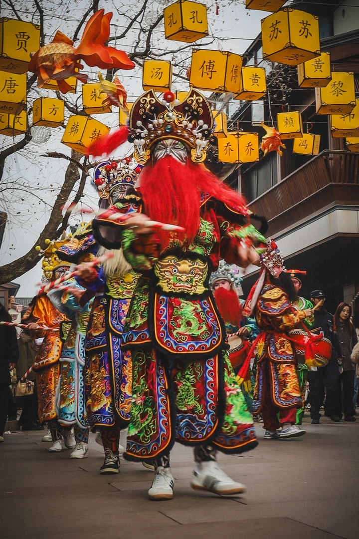 台州天台的赭溪古街上, 偶遇远道而来的潮汕英歌舞。 以中焦镜头定格下这场跨越地域的非遗狂欢, 暖黄姓氏灯笼与金鱼灯串衬着红髯武士的浓烈服饰, 慢门捕捉双槌挥舞的动态, 让千年民俗的热血与江南市井的烟火气撞出最鲜活的画面。