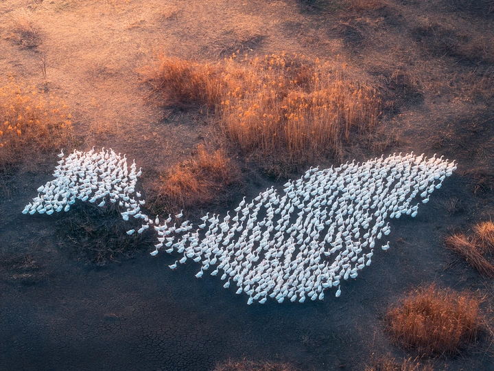 清晨一群大鹅吃食,空中看像一朵一朵小雏菊