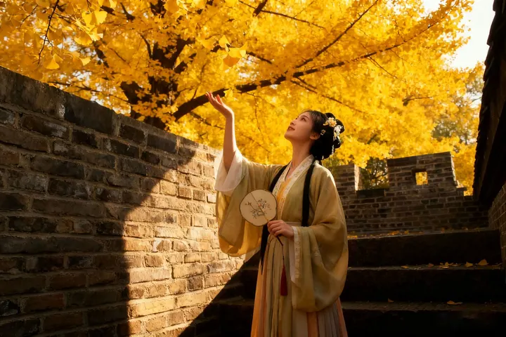 秋光漫过城北的旧墙,宋衣女子的身影从远渐近,又缓缓走向光影深处。她或侧倚墙垣,或垂眸沉思,又或于风里轻拈一枚落叶。金叶簌簌落满砖缝,每一步都似在为这方天地写下秋的诗行。
