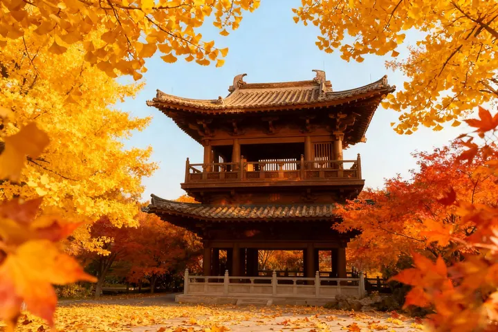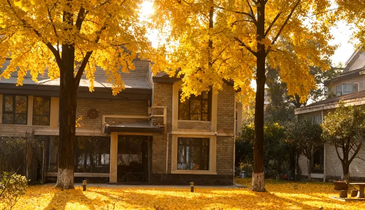 金风漫过古院廊檐,落叶铺满小径。 汉服女子衣袂轻扬,与秋光同入画。 高楼在暖阳里静默,银杏枝垂落金叶, 是城市写给秋的温柔诗行。