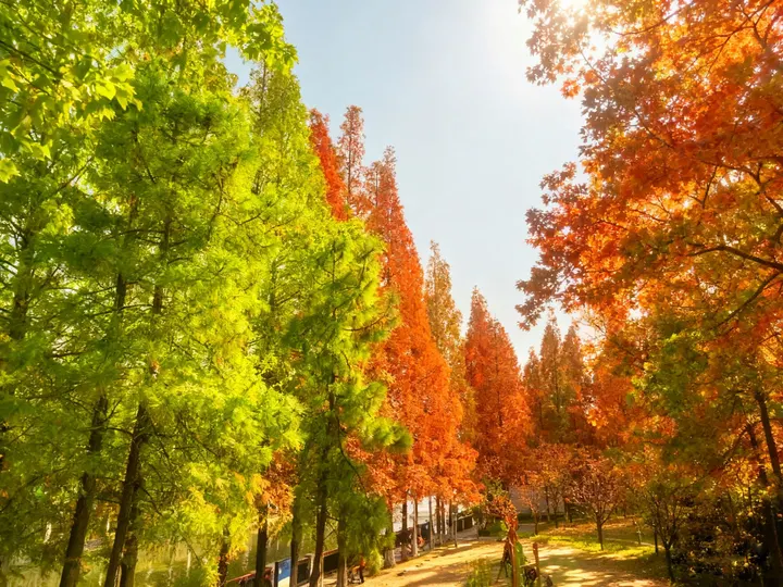晴光漫过秋林的枝桠,把半树青绿、半树橙红浸得透亮。风掠过叶隙时,几羽飞鸟斜斜掠过天幕,翅尖沾着日光的暖,又轻落在红杉的梢头——城市的秋意,便在这林叶的斑斓与雀鸟的振翅里,温软成一帧流动的画。